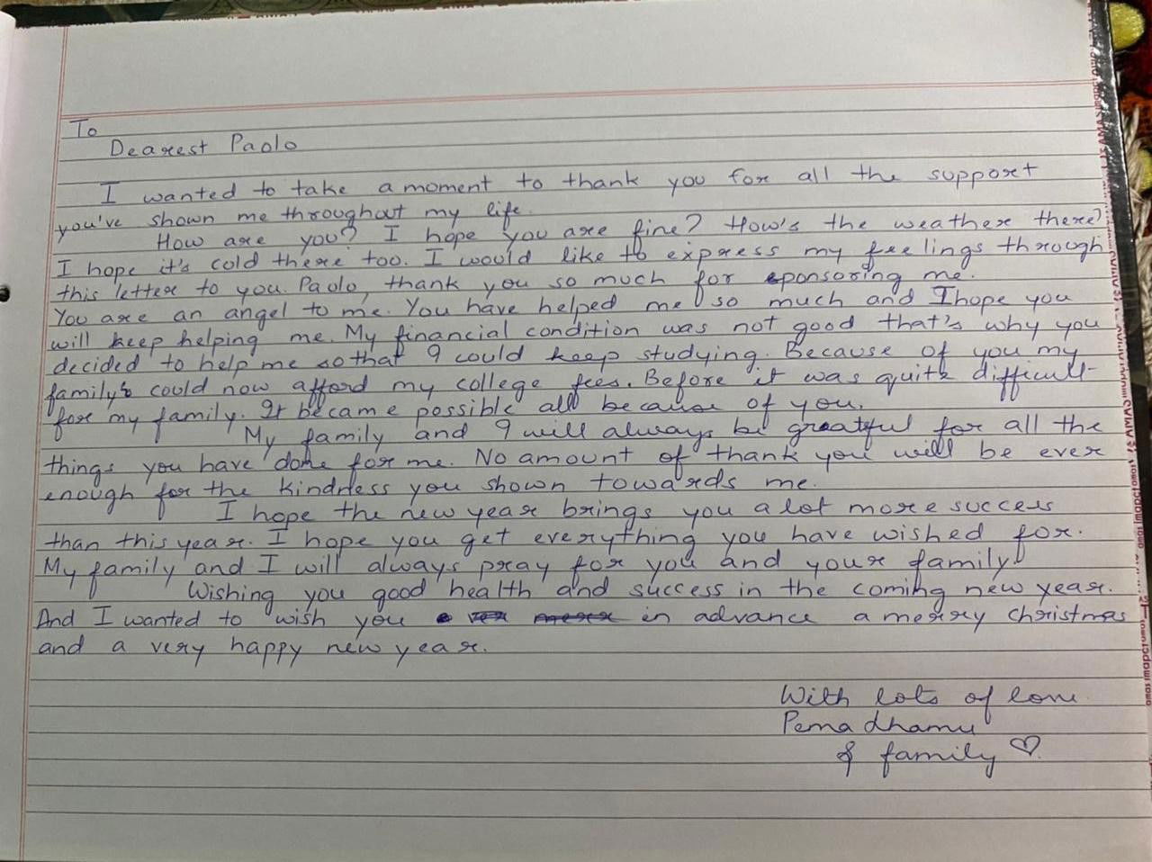 Qui sotto puoi trovare una delle tante lettere che la piccola Pema manda ogni anno a Paolo.