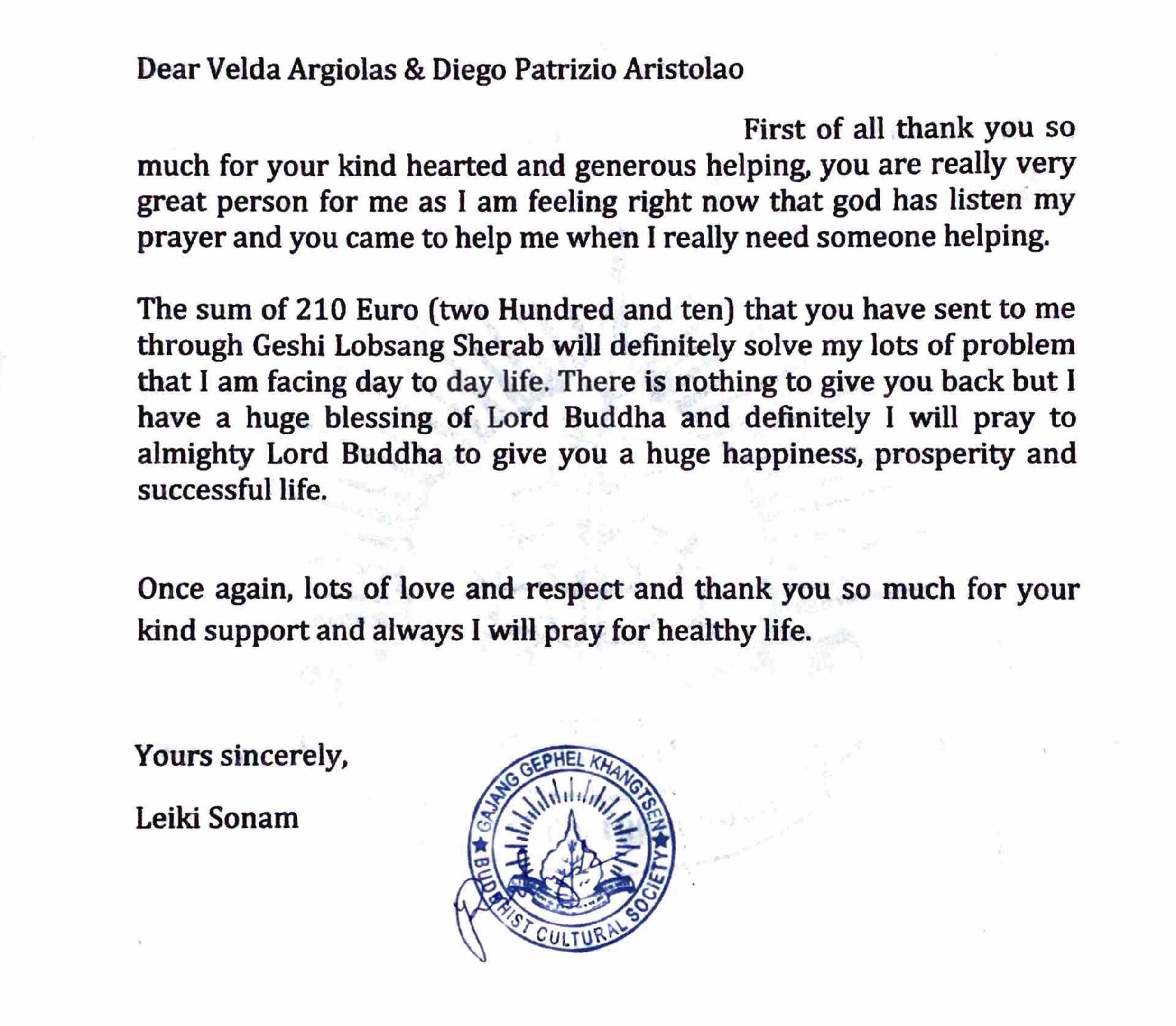 La somma di 210 euro che mi avete inviato tramite Geshe Lobsang Sherab risolverà sicuramente i miei numerosi problemi quotidiani. Non ho nulla da darvi in cambio, se non la benedizione del Buddha e sicuramente pregherò il Buddha onnipotente affinché vi conceda felicità, prosperità e una vita di successo.